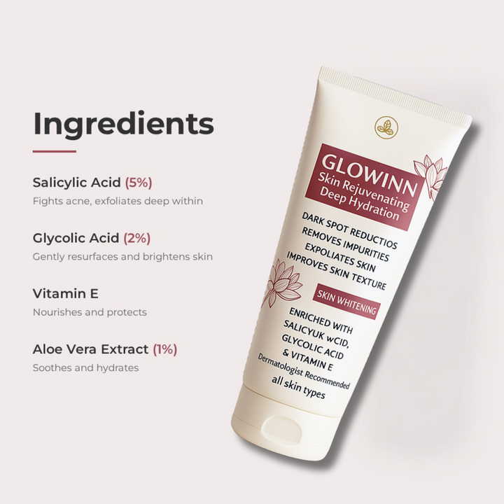 Glowinn Facewash is a skin rejuvenating and deep hydration face wash. Glycolic acid and Salicylic acid along with lactic acid helps to reduce dark spots, control acne and keep skin glowing. Glowinn facewash is free from Paraben, silicones and artificial perfumes.